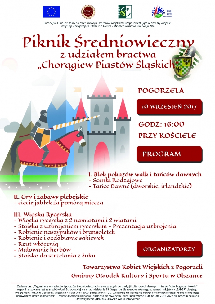 W dniu 10 września br. od godziny 16;00, przy klościele w Pogorzeli odbędzie się Piknik Średniowieczny z udziałem bractwa "Chorągiew Piastów Śląskich".