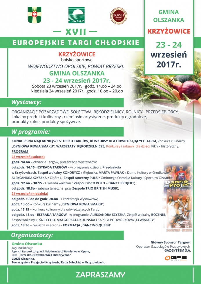 W dniach 23-24 września 2017r. w miejscowości Krzyżowice (boisko sportowe) w Gminie Olszanka odbędą się XVII Europejskie Targi Chłopskie.