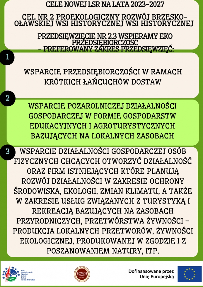 Prezentujemy możliwości wsparcia finansowego w ramach wdrażania Lokalnej Strategii Rozwoju Brzesko-Oławskiej Wsi Historycznej .Wkrótce na obszarze objętym LSR ze wsparcia w ramach Przedsięwzięcia 2.3 Wspieramy EKO Przedsiębiorczość będą mogli skorzystać rolnicy, osoby fizyczne oraz przedsiębiorcy.