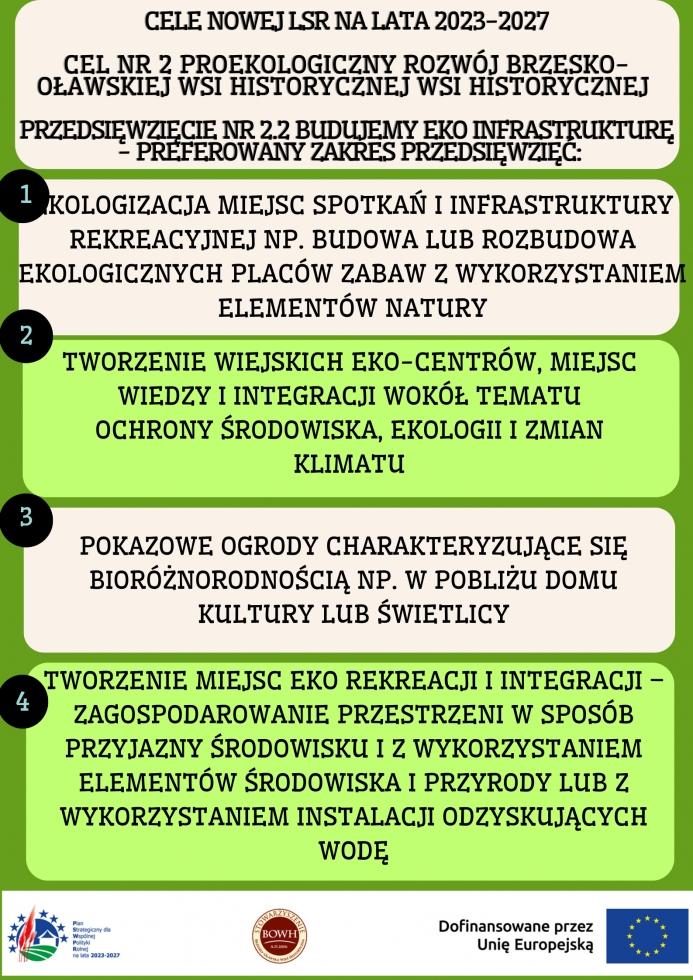 Kolejna odsłona możliwości finansowania różnych pomysłów w ramach wdrażania LSR Brzesko-Oławskiej Wsi Historycznej. W ramach operacji dotyczących rozwoju bazy rekreacyjno-sportowej i kulturalnej, przewidzieliśmy Przedsięwzięcie 2.2 - Budujemy EKO Infrastrukturę.