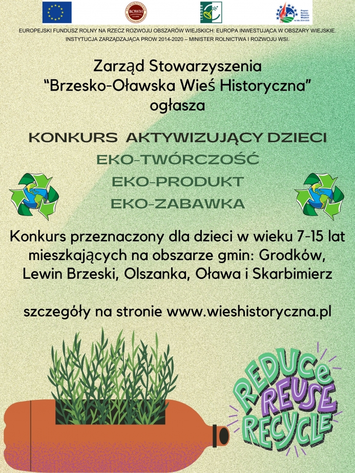 Zarzad Stowarzyszenia „Brzesko-Oławska Wieś Historyczna” ogłasza konkurs, którego celem jest m.in. promowanie postaw proekologicznych u dzieci i młodzieży, propagowanie haseł proekologicznych: zero vaste, nie marnuj, nie wyrzucaj - wykorzystaj, nie kupuj – poszukaj w domu, zrób to sam, pobudzanie twórczej inicjatywy dziecka.