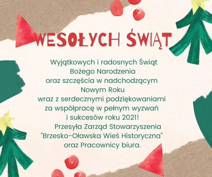 Uprzejmie informujemy, iż w  dniu 24 grudnia (Wigilię) oraz 31 grudnia (Sylwestra) br. Biuro Stowarzyszenia "Brzesko-Oławska Wieś Historyczna"  będzie czynne do godziny 13:00.
