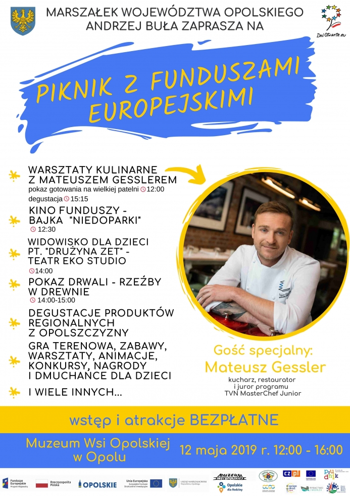 Serdecznie zapraszamy do udziału w Pikniku z Funduszami Europejskimi, który odbędzie się w niedzielę 12 maja 2019 r. w Muzeum Wsi Opolskiej w Opolu-Bierkowicach