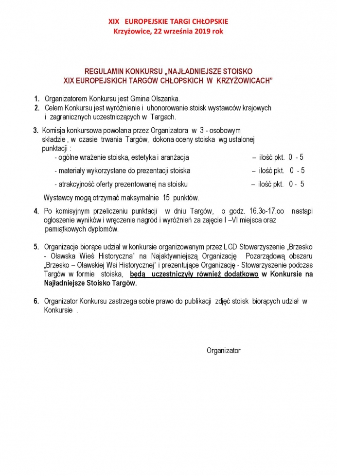 Gmina Olszanka przy współpracy Lokalnej Grupy Działania Stowarzyszenia „Brzesko-Oławska Wieś Historyczna” , Towarzystwa Przyjaciół Krzyżowic i Rady Sołeckiej w Krzyżowicach oraz Gminnego Ośrodka Kultury i Sportu w Olszance zaprasza do udziału w XIX Europejskich Targach Chłopskich, które odbędą się w miejscowości Krzyżowice (boisko sportowe) w Gminie Olszanka.