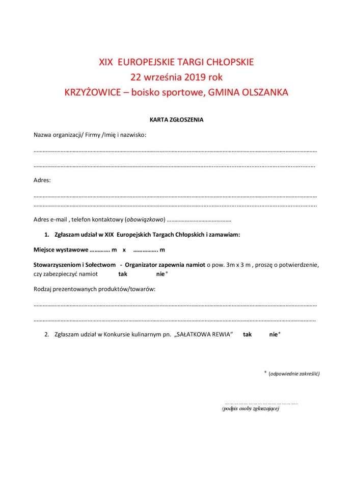 Formularz zgłoszenia znajduje się poniżej .Zgłoszenia będą przyjmowane do dnia 13 września 2019r. na adres mailowy: sekretarz@olszanka.pl Zgłoszenie można przesłać pocztą tradycyjną na adres: Urząd Gminy Olszanka, 49-332 Olszanka 16 lub faxem – 77 4129683 wew. 106 Wszelkie pytania prosimy kierować do Pani Ewy Rosińskiej – Sekretarz Gminy pod nr. tel. 774129683 wew.103 lub 660492647