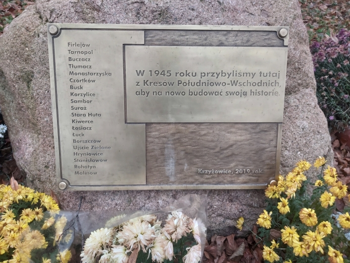 - ustawienie na środku okręgu głazu wraz z mosiężną tablicą pamiątkową, na której wyryte zostały nazwy miejscowości pochodzenia obecnych mieszkańców Krzyżowic,