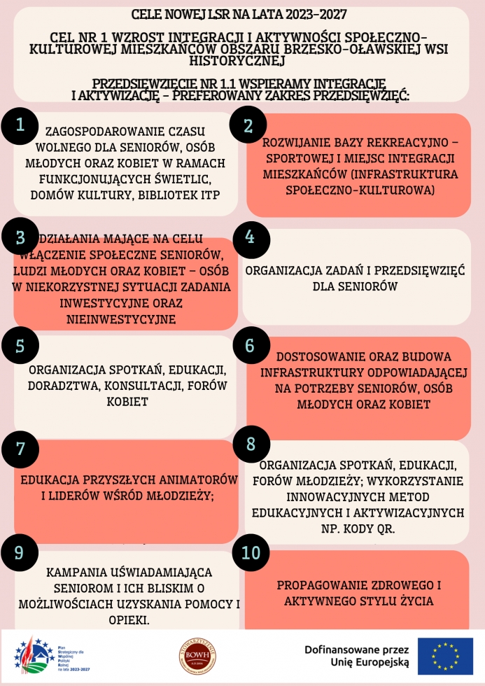 W najbliższych dniach będziemy publikować szczegóły dotyczące celów oraz preferowanego zakresu przedsięwzięć, które są priorytetowe dla realizacji LSR. Zachęcamy do śledzenia neszej strony internetowej. Przybliżymy, jakie działania planujemy wspierać, aby zwiększyć integrację społeczną i aktywność mieszkańców naszego obszaru.